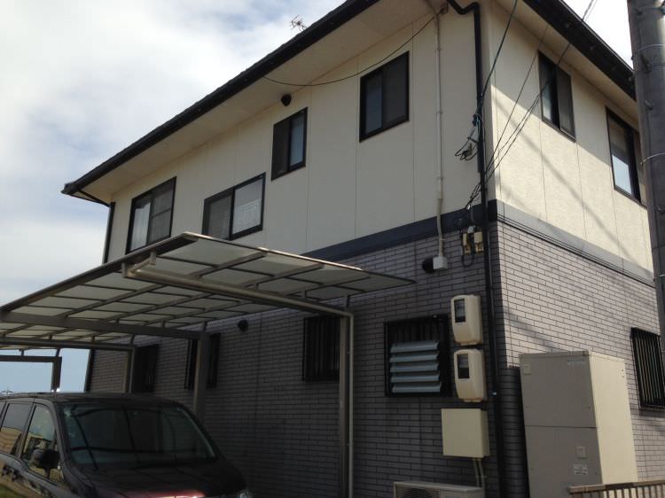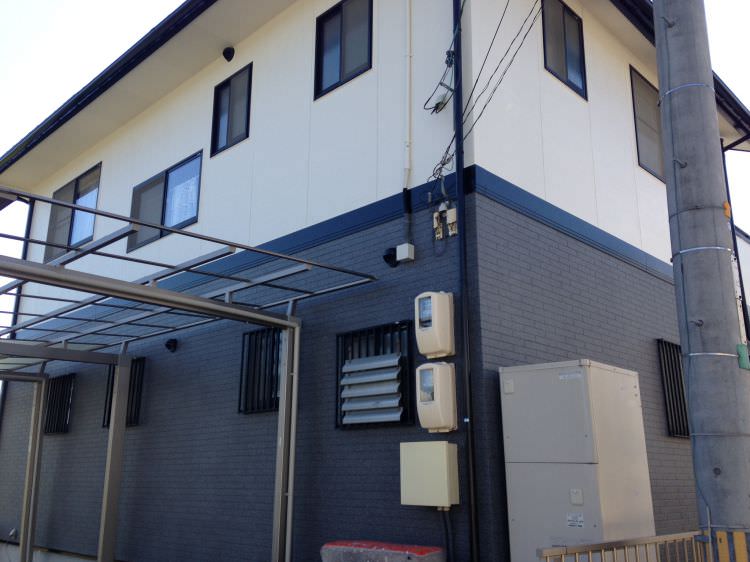 お客さま邸の外壁材は、1階・2階共に「窯業系サイディングボード」ですが、1階のみ意匠性(デザイン性)の高い「タイル調サイディングボード」という種類のものでした。