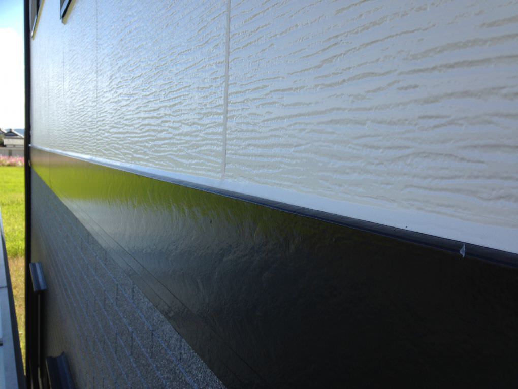 帯を境にして色の塗り分けはもちろん、塗料も変えて1階と2階とで全く異なる雰囲気を出しました。