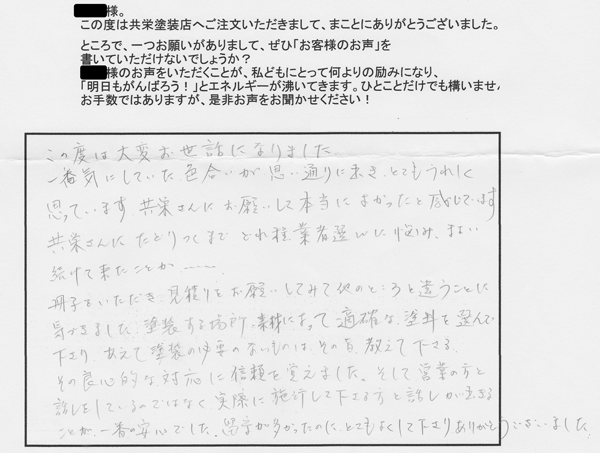 一番気にしていた色合いが思い通りに出き、とてもうれしく思っています。共栄さんにお願いして本当に良かったと感じています。