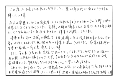 お見積りの際には、仕事中にも関わらずご帰宅してお立合いくださり、さらには私を信用してご注文をいただけたこと、本当に感激しました。